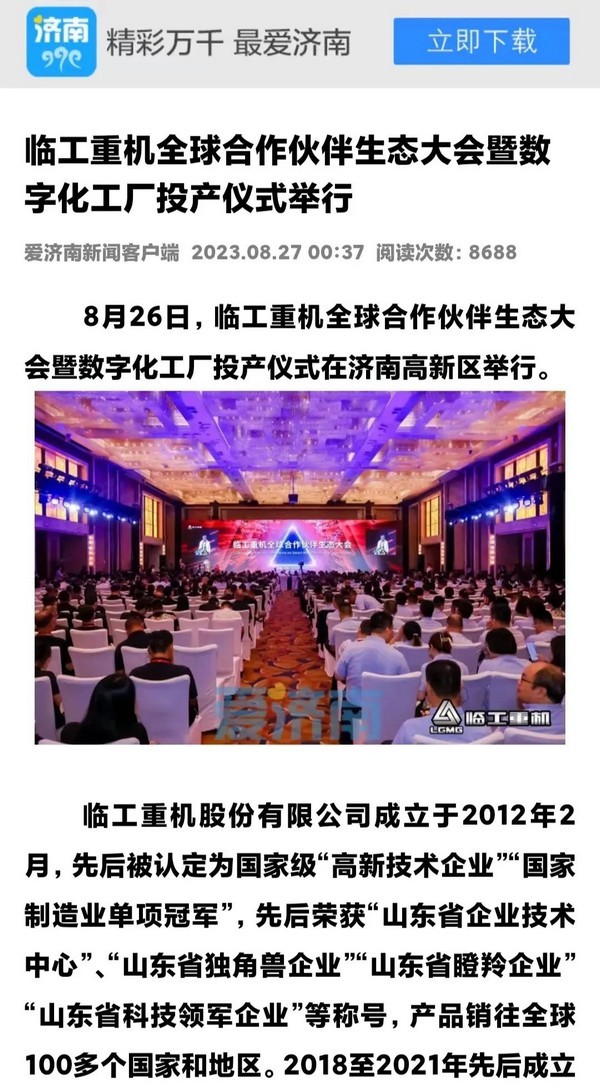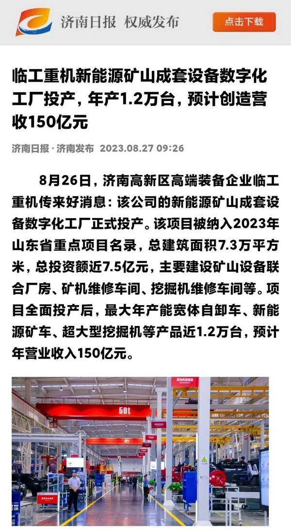 8月26日,臨工重機數字化工廠投產活動在濟南高新區智能裝備城舉行。臨工重機新能源礦山成套設備數字化工廠項目,入選2023年山東省重點項目,總建筑面積7.3萬平方米,總投資額近7.5億元,最大年產能寬體自卸車、新能源礦車、超大型挖掘機等產品1.2萬臺,是山東省首個年產能超萬臺礦山設備數字化工廠。